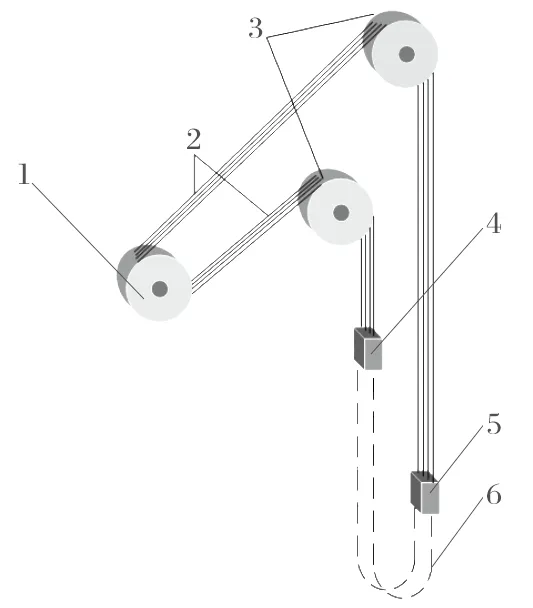 礦井多繩摩擦式提升機是我國礦井領域zui常用的提升裝備,主要用于提升人員、設備和物料。該提升系統(tǒng)主要由驅(qū)動裝置、多根鋼絲繩、上下天輪及罐籠等部分組成,其結構如圖1 所示。其中,驅(qū)動裝置由電動機、減速機和聯(lián)軸器等部分組成,可將電能轉(zhuǎn)變?yōu)闄C械能,實現(xiàn)對罐籠的提升和下放;上下天輪用于對鋼絲繩進行改向。提升鋼絲繩在天輪位置會出現(xiàn)彎曲變形,鋼絲繩的應力會出現(xiàn)突變。