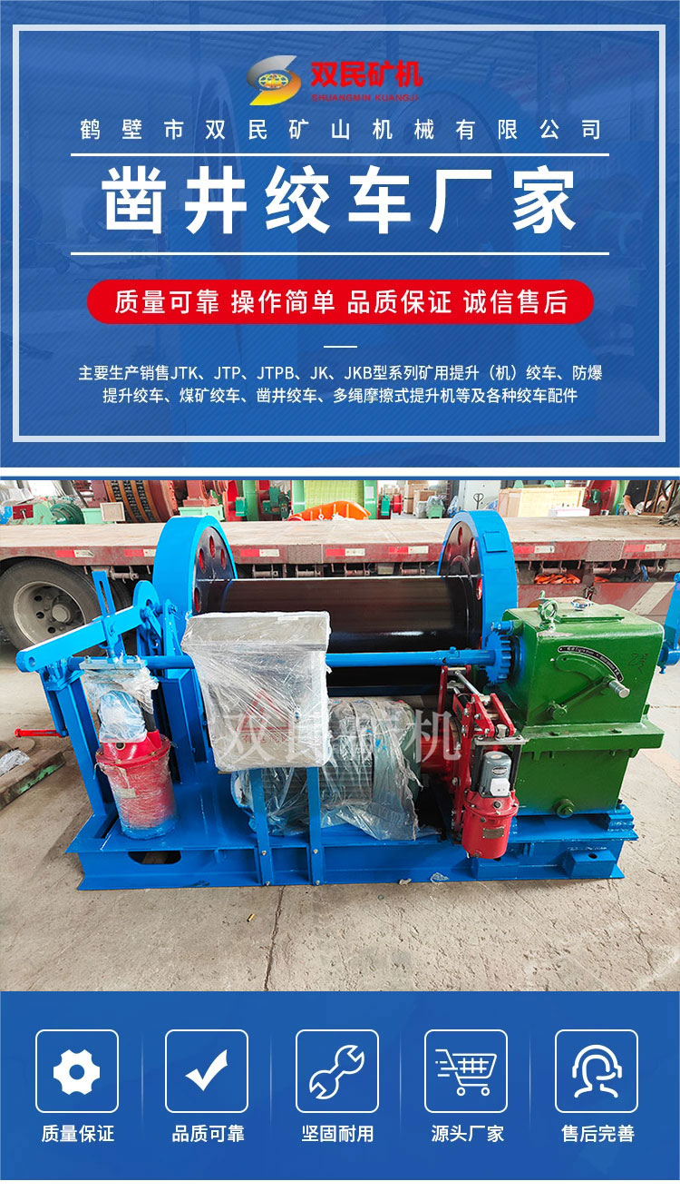 鶴壁市雙民礦山機(jī)械有限公司是鑿井絞車廠家,以制造大型礦山提升設(shè)備,電器成套自動化控制系統(tǒng)為主的科研型高科技企業(yè),是國家礦山專用設(shè)備及配件產(chǎn)品定點(diǎn)生產(chǎn)單位。主要生產(chǎn)、銷售JTK、JTP、JTPB、JK、JKB、JKM、JKMD型系列礦用提升絞車、礦井提升機(jī)、多繩摩擦式提升機(jī)、JZ型鑿井絞車及礦山各種成套設(shè)備及配件。